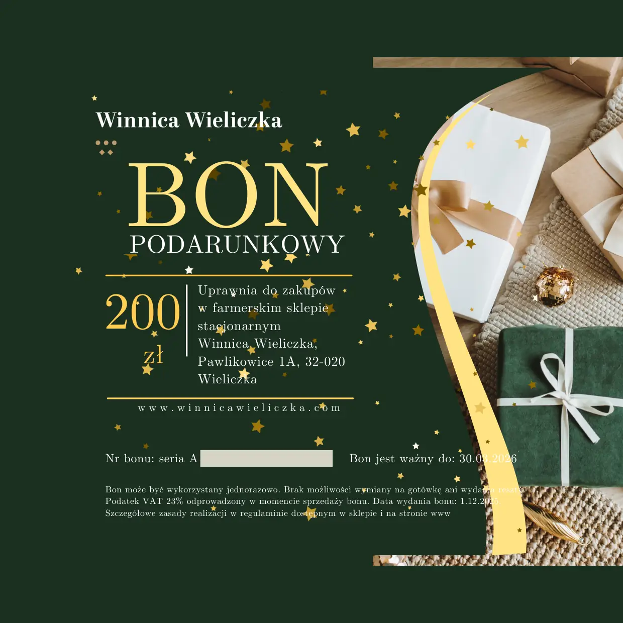 Bon podarunkowy do wykorzystania na wina i cydry w sklepie stacjonarnym w Winnicy Wieliczka